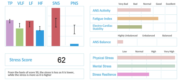 Já nyní řeším chronický stres. Níže na obrázku vidíte můj HRV graf, kde je vidět, že mám chronicky vybuzený sympatikus (červený sloupec SNS) – který může za stres. A slabý parasympatikus (milimetr vysoký modrý sloupec PNS) – který může za klid.